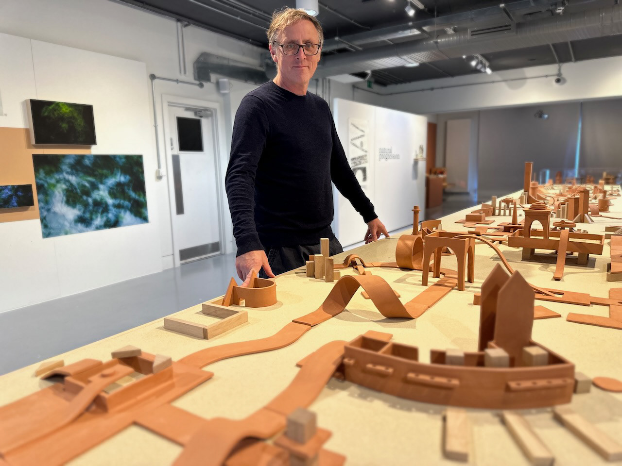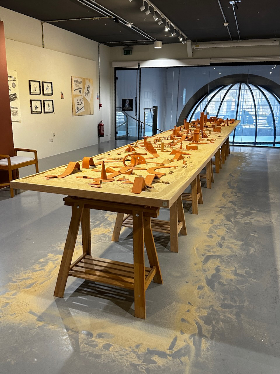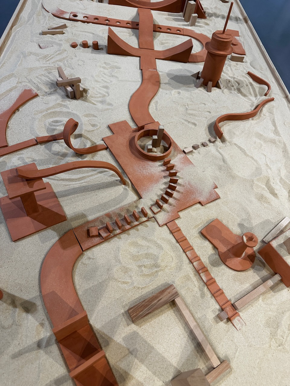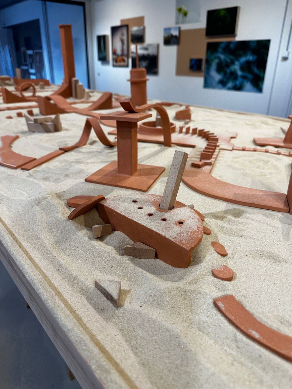 In September 2024 I was invited to exhibit 'Surreal City' in a group show at the Wilson Gallery in Cheltenham. A repositionable playset of handmade terracotta pieces and wooden Poleidoblocs from the 1950's, laid over playsand and covering a 24' handbuilt table, this represented the culmination of my third year undergraduate studies at the Uiversity of Gloucestershire (previously Cheltenham School of Art). Eventually, during its time at the gallery, visitors took the city to its natural and logical crescendo. like a war zone, or a city deserted for a thousand years, buildings were tumbled and sand was scattered to the wind.